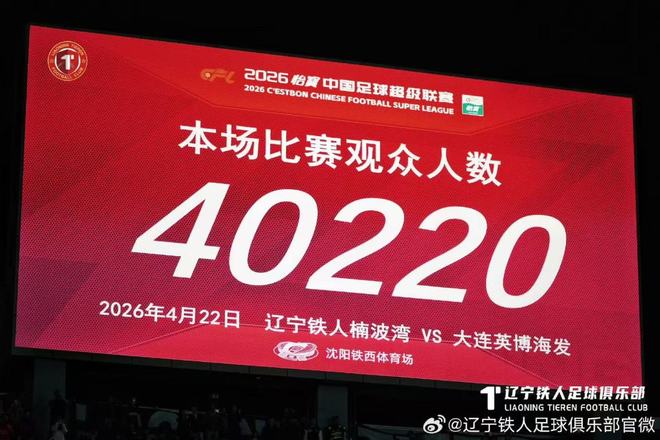 北京时间4月22日晚间,中超联赛第七轮辽宁德比,辽宁铁人坐镇主场沈阳铁西体育场迎战大连英博,本场比赛共有40220名观众来到铁西体育场观战,其中客队球迷近6000人。据统计,这是铁西体育场首次突破4万人,也创下了该体育场的历史最高观众人数纪录。